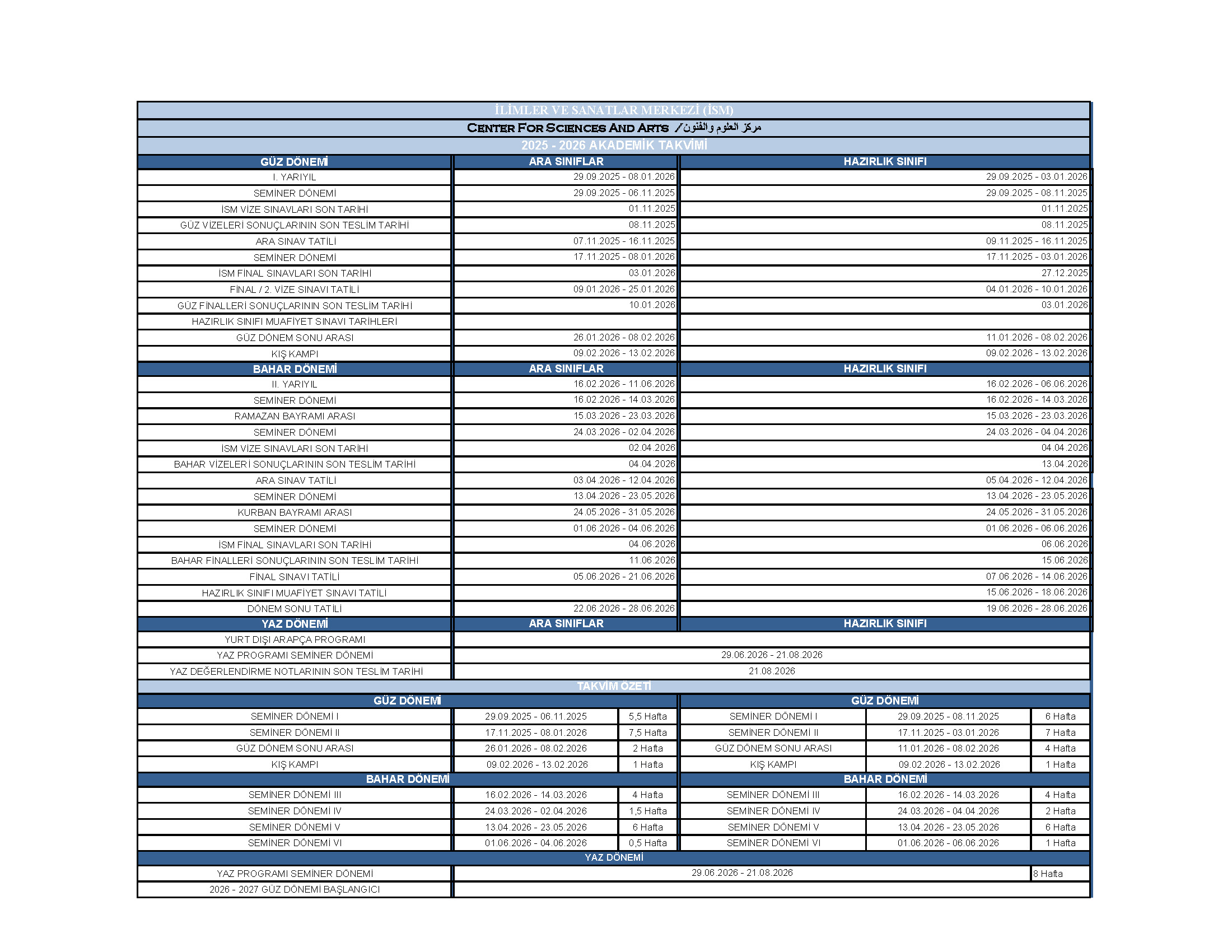 İSM her eğitim öğretim döneminin başında üniversitelerin akademik takvimiyle uyumlu olacak şekilde akademik takvimini yayımlar ve ârızî bir durum olmadığı müddetçe güz, bahar ve yaz dönemlerinde akademik takvimde belirtilen tarihlere bağlı kalır.